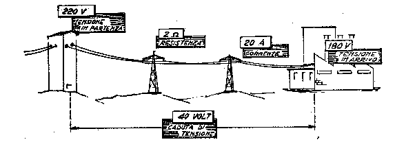 Ad esempio: la caduta di tensione di una linea elettrica della resistenza di 2 ohm quando è percorsa da una corrente di 20 Ampère, è di: