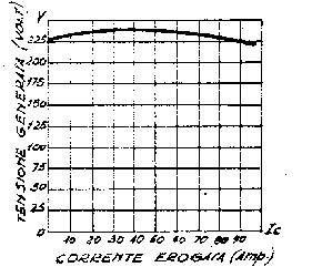 La variazione della tensione, generata da questo tipo di dinamo, all’aumentare della corrente erogata è riportata in figura.