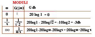 Solo utilizzando programmi di calcolo è possibile tracciare in modo preciso i diagrammi di Bode. In questo caso, un diagramma semplice, calcolando solo 3 punti si può tracciare un andamento, per quanto approssimato, abbastanza attendibile. I punti che conviene prendere in considerazione sono quelli corrispondenti ai valori di pulsazione e di fase pari a 0, 1/t, infinito. Si rammenta che: Conviene compilare una tabella come in figura. Si rammenta che il modulo del guadagno è espresso in decibel mentre sull'asse delle ascisse si riporta il logaritmo in base 10 della pulsazione. La fase va espressa in gradi o radianti sempre in funzione del logaritmo della pulsazione. |